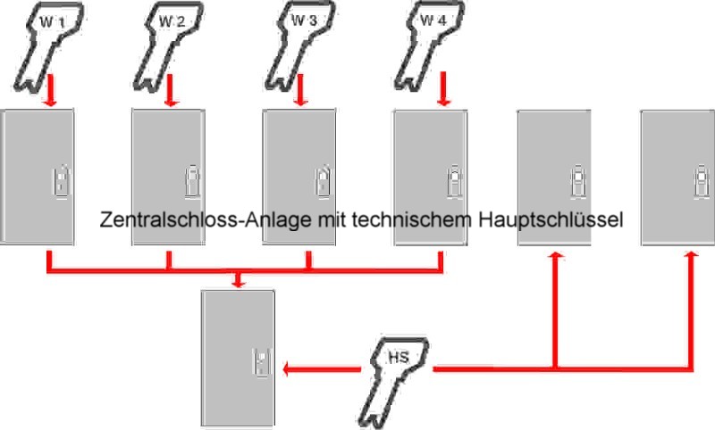 Einzelne Schließbereiche (z.B. Wohnungen) sind mit verschiedenschließenden Profilzylindern ausgestattet. Jeder Schließbereich (Wohnungsinhaber) schließt mit seinem Schlüssel seinen Bereich und den Zentralzylinder (Hauseingangstür). Zusätzlich kann technischer Hauptschlüssel für alle technischen Betriebsräume eingeplant werden.