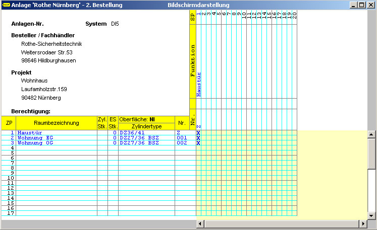 Mit diesem Plan wird beginnend bei der Planung dem Benutzer/Eigentümer die Verwaltung der Schließanlage jederzeit möglich. Die Erarbeitung des Schließplanes erfolgt in der Planungsphase mittels einer .xls-Datei, so dass der Datenversand bis zur Bestellfassung per Email möglich ist. Die Werksdaten werden nur per Versand übermittelt.